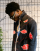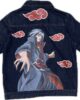 This stylish denim jacket features an eye-catching design inspired by the popular anime “Naruto.” The back showcases a detailed, colorful illustration of a fierce ninja character in action, surrounded by iconic red and white swirling clouds that symbolize the Akatsuki organization. The jacket combines classic denim with vibrant, custom artwork, making it a perfect statement piece for anime fans and streetwear enthusiasts alike. Its durable fabric and relaxed fit ensure both comfort and long-lasting wear, while the bold design adds a touch of edgy, artistic flair to any outfit.